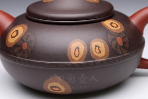姚亚勤老师此款《水云间》壶如意云纹装饰壶盖,壶身质朴古拙,很有古韵禅意。壶身饱满坚挺,下腹部线条修饰更显层次分明;直流出水很冲,弯柄圈握适手,一点垂耳增添曼妙线条美感;壶身正面刻绘一枝莲蓬,反面陶刻“真趣”二字,增添生活意趣。身有莲蓬,盖有流云,是为《水云间》,简简单单,亦为真禅意也