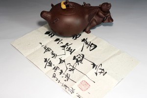 陈夕良老师现为国工,是2014年晋升高工的不二人选,精于紫砂造型设计,擅长大品壶制作,这把《三羊开泰》壶原矿底槽清制成,680cc壶体造型新颖,“三羊开泰”寓意吉祥,金田老师合作刻绘,图文相应,更添美满之意!