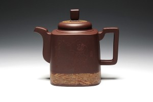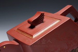 《英雄壶》, 壶体四方,刚毅俊朗,造型与刻绘相应,以苍鹰颈项做壶流,线条流畅出水利落,壶盖跟壶底镶金工艺,四方壶柄与斜面平齐,正是鹰尾,嵌盖上塑一只翅膀做壶钮,生动传神!