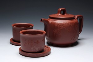 《禅悟》套壶共一壶二杯二托盘,清水泥制壶形制简洁,620cc壶体造型古朴大方,周伯娟老师全手工艺精湛,值得收藏。伟涛装饰,壶体反面陶刻“观鱼知道性,养鹤悟禅心”,正面刻绘《禅悟》图,达摩松下悟道,细致入微