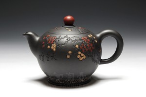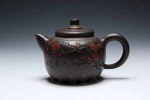 苏敏老师此黑泥《玉香容》泥色深沉,神秘、古拙,器型圆融,线条流畅,红泥壶钮造型立体,黑与红色泽搭配极佳。更有研高沈汉生老师合作刻绘绽放的红、黄双色梅花,着实美丽秀雅。