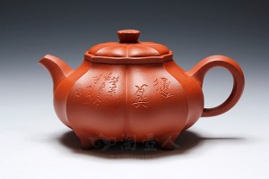 吴永明,2013年国工,受著名书法家陆修伯指导,有较好的书画基础,陶刻功底深厚,作品均为自制自刻,这把《四足菱花》为高难度筋纹作品,非常考验老师的制壶功底,推荐!