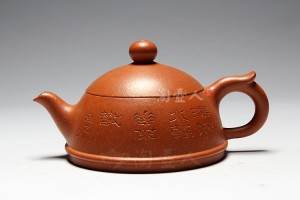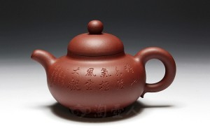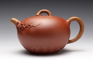 朱泥《小惠泉》壶,形制优雅线条流畅,色泽桔红微嫣,实在美观。圆润的壶钮缀在盖顶中央,140cc的壶体着实精巧,工艺细致。壶体刻绘小鸟花朵,并陶刻茶诗一句,曰“汤嫩水轻花不散”,令人不自觉对上下句“口甘神爽味偏长”,喝茶品茗,回味无穷!