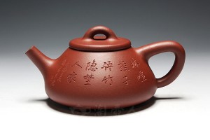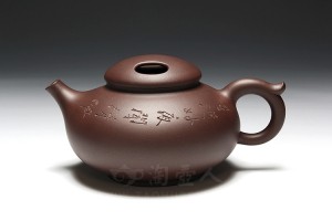 小培老师的壶风多浓厚古雅,这把460cc的华颖,壶身略扁但饱满而壶韵充沛,线条丰润流畅,鼓起的圆盖与壶颈精美吻合,流把钮皆古拙敦厚。王福君老师合作刻绘,花叶小鸟,笔触繁复,但见精细之美;正面陶刻“得山水清气,极风云大观”,开阔雄浑…