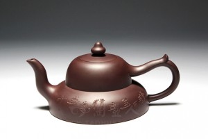 周盘壶,造型古雅,原矿紫泥砂感强烈,拙味浓厚。540cc壶体形制简洁大方,磨盘壶身敦厚稳重。壶身陶刻“常闻清味应来品茶”,反面刻“独爱清幽”,徐安碧老师自制自刻,增添几分安然自然。