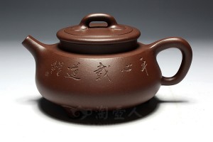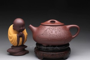 徐伟强老师这把景舟石瓢,紫泥色泽厚重内敛,严钢老师合作刻绘,正面绘猛虎下山,气势雄健,反面陶刻“啸风”:“眼中顿觉妖狐静,不道相者是画图”,刻绘风格与雍容大度的壶体造型相一致,相得益彰!