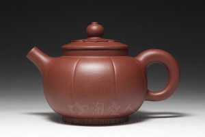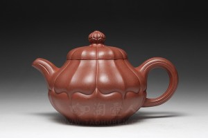 壶身经过精密分割为上下各六瓣菱花,以壶腹中间一条线为分界,壶肩处菱花是向下倒扣,壶腹处菱花则如观音莲花宝座,自底盘向上张开、围拢。上下两瓣菱花交错吻合,如齿轮咬合紧密,筋纹凹凸相接,很有层层齿轮转动的动态感