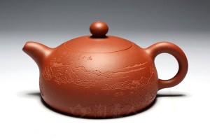 这款半月壶浑厚朴拙,简洁大气,壶盖与壶体镶接精美,子母线紧紧融合,一弯流嘴头略收敛,壶把简洁明了若梳理整齐的发髻。通景山水画遍布壶身,让人顿时心胸开阔,吐出一口浊气,涤荡身心。