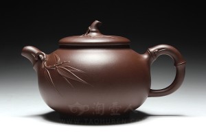 流把钮均为竹段构成,壶钮竹段中空为壶盖气孔,与壶盖相接处,一圈竹节修饰自然,其上一点嫩芽与小截分杈塑于壶盖,三两片竹叶线条蹁跹,似随风动;壶流一变嘴,从竹节处挑空塑竹枝贴花于壶身正面,真正是“竹叶青青不肯黄,枝条楚楚耐严霜”;壶柄弯折成耳形,彰显竹之韧性。