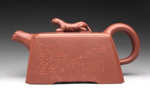徐伟强老师这把豹方壶,方器雄健刚毅,严钢老师合作刻绘,风骨俱佳。壶口四方,嵌盖吻合紧密,蹲伏的豹子壶钮霸气十足,豹体铺金砂,