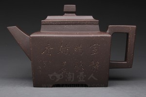 卢宁刚老师一把《英雄壶》,造型生动别致,壶身刻苍鹰立翠柏,目光炯炯振翅欲飞,于高处睥睨众生。 壶体四方,刚毅俊朗,造型与刻绘相应,以苍鹰颈项做壶流,线条流畅出水利落,壶体为梯形,前方后斜,正是鹰身的流线,四方壶柄与斜面平齐,正是鹰尾,嵌盖上塑一只翅膀做壶钮,生动传神! 壶体反面陶刻“高瞻远瞩”四字,一把《英雄壶》令人想起“羽扇纶巾,谈笑间,樯橹灰飞烟灭”的淡然,“江山如画,一时多少豪杰”的历史感慨…
