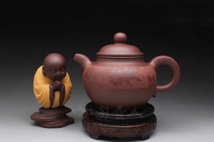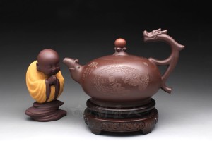 紫泥《龙凤呈祥》壶,造型新颖!460cc的壶体圆身截盖,盖上水波纹拱起一粒红泥圆钮,正若海上红日冉冉升起。壶流为龙口吐水,壶柄为龙身飞腾,龙头擎空直望红日,吞云吐雾气势非凡;壶身正面刻绘凤凰环日,火炎烧尽世间奸邪之气,旁刻“凤”自;反面陶刻“呈祥”。如此,自右向左恰好为“龙凤呈祥”!