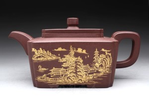 周志良老师这把底槽清方逸壶,泥色稳重而泥质纯正,350cc的壶体方正刚毅而线条流畅,描金山水富贵大气,壶身正面泥绘水中小岛,岛上亭台、楼阁、飞塔描画细致,间或奇石构筑高坡,侧生古木苍然伸展。远山连绵,水上帆舟点点,开阔心胸也。反面陶刻清乾隆描金山水八卦纹壶壶铭:“吸之两腋风生,玩之四周香拂”。篆书字体古雅,大气十足