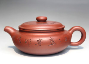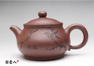 此款扁仿古采用原矿红皮龙,由刘老师自制自刻,壶体正面陶刻有“日日盛宴非福 粗茶淡饭延年”行书字样,最大特色为壶盖陶以五只鱼逆时针游成一圈,壶内壁底还刻以“一砂一茗皆佛陀,目之所及,心之为道-一飞记”字样,篆刻细腻,活灵活现;粗实的壶的、微扁的壶把,一弯嘴紧挨壶肩,缓缓胥出。