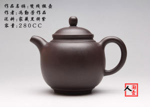 冯老师家中所藏老紫泥制作而成,紫中泛黑,若娇艳的玫瑰盛放,高贵迷人。整款壶为圆球形,小圆珠的壶钮,圆润可爱,嵌盖严丝合缝。整款壶圆中稍扁,丰腴饱满,给人亲和贴近之感。尤其是细腻的砂质,更添几分女性特有的柔美,把玩在手,如同和一肤若凝脂的美女亲近,只可意会不可言传。