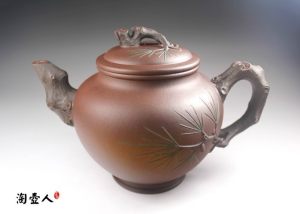 此款《东坡石瓢》是由刘一飞老师采用原矿黄金段泥全手精制,正面图案陶刻在月牙松涛下,一老者借光颂读,刀工细腻,比例协调;背面刻以行书刻有“人生如梦,一尊还酹江月”字样,壶侧钤有“东坡句·野风刻”,刀功老沉,工艺精湛;一流直嘴、宽实把、微鼓盖、三钉足;整体壶身成倒三角造型,出水流畅有力,造型简练,古朴大方,端庄稳重,刚中有劲,敦实调和。