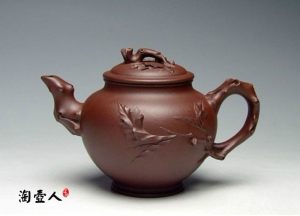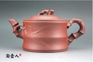 此壶器形完整,壶身为两节大竹段造型,匀称优质,两条云肩线一前一后,一高一矮,相映成趣。三弯流呈四节竹段造型强悍胥出,出水爽利,耳形壶把毫无增减之势,一株竹叶自壶把下端竹节处胥出,贴于壶腹之上,竹叶随意舒展开来,布满大半个壶体,韵致悠长。