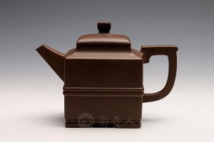 此款亚明四方虽为经典器型,然而在龚杰老师手中形神俱备,更加出彩,方形桥钮,宽厚有力,四方鼓盖,折线分明,截盖压于壶口之上,气势雄大,弯流在方器中极为常见,其霸气十足