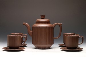 该茶具由一把壶、四只茶杯、四盏碟子组成,此壶用深紫砂泥制作,似檀木色,造型以十八瓣菊花构成,并变化成反面菊花瓣,筋纹深浅过渡自然,纹理清晰,口盖准缝通转。三弯嘴形优雅大方,扁平圈把上置飞扣。盖钮亦饰十八瓣造型,一丝不苟,气宇轩昂,雍容大度。整器纹理清晰、过渡自如,点、线、面严谨和谐。