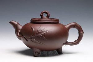 此壶造型为一截松段,钮、流、把皆做松树枝节,结构严谨,比例合理,搭配的恰到好处,壶面为树皮斑驳的纹理,壶钮更是巧取松节一段,似与流、把相连,并以松针装饰,极其逼真,原矿老段泥作胎,色泽柔和,质感强烈,整壶形意俱佳。