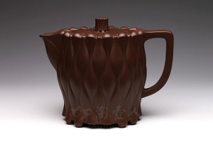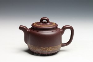 此器以老树为题材,加以创新制成此壶。壶体上窄下宽如树桩形态,嵌盖吻合严密,盖上以树枝弯成桥钮,并贴塑枝叶,流把以树枝弯成,弧度优美,形态自然,壶把一侧贴塑树叶;壶身节疤分布合理,仿生形象,不失天然。