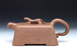 此壶采用了原矿青灰泥制作而成,壶容量为220cc,壶钮以豹饰之,壶嘴似豹的头,壶把似豹的尾,壶身与壶钮相呼应,方器成型难度大,棱角分明,费时费工,造型新颖,如豹子飞奔在大草原中,寓意勇往直前。