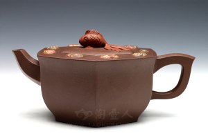 采用了原矿老紫泥制作而成,壶容量为380cc,壶身呈六方碗型,整体线条呈现上密下疏,这种六方壶体款式的壶由泥片衔接,而此种方法的制作难度极大,要做到恰到好处需极为细致,六方壶嘴,出水爽利,壶把呈四方,转折有力度,端握舒适称手,金鱼为壶钮,鱼身上的纹理鳞片层次坐落有感,虚实分明,神态自若,寓意吉祥,尾部摆动,简洁有力,浪花相随,制作精良。