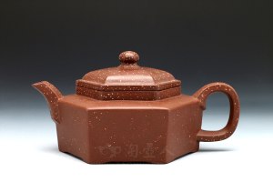 “方壶之秀”周志良老师此款《六方石瓢壶》曾获中国工艺美术金奖,原矿底槽清泥质清朗大方,方器与经典石瓢结合,全手工镶接成型,增加了线条的阳刚之美,这也是周志良老师多年研究壶型的成就之一,当然其制作工艺难度便也增加了。