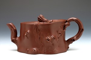黄丽萍,2015年高工,1960年出生于宜兴陶艺世家,先后师从谈尧坤,徐秀棠,汪寅仙等大师学艺,作品擅长薄胎花货制作,祖先三代均工作于紫砂工艺厂,父亲黄月君为紫砂一厂开厂元老之一,地位甚高,很多紫砂老泥均由其配置,并与各位老艺人交情颇深,从小受父辈艺术熏陶,当前作品深受国内外收藏家的喜爱。采用了原矿底槽清制作而成,壶容量为1960cc,壶体为饱满大圆,三杈树桩提梁构筑虚空间,虚实相应独具审美特色,盖身贴塑立体的石榴枝叶,壶嘴为一弯流,设计为树枝的感觉,空洞苍古,盖上以一颗石榴果做壶的,果实成熟,丰