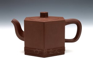 高湘君,1957年生于宜兴,2012年研高,江苏省陶瓷艺术大师(2016年 第二届)、江苏省工艺美术大师(2016年 第六届)。先后师承高工李碧芳,省大师谢曼伦,作品在集承师传统和花器基础上,力求新创毅和创新,对紫砂文化有一定的研究,善制光素器、花器等多种器型,尤擅竹器。这把《四方阴筋竹鼎》由原矿紫泥制成,壶钮、壶嘴、壶把均似竹段,壶肩、壶底均似竹节。比起一般仿竹之壶,它的竹枝更为粗犷坚挺,且具沧桑遒劲的韵味,加之壶身为四方之器,观之端正而挺拔,二者相结合,更给人一种高风劲节之感。