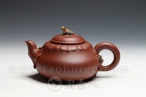 壶身扁圆,渐收至壶肩,壶腹向外微鼓,壶肩贴塑八片菱花花瓣,与主题相应;壶盖向上鼓起,并塑有莲子、青蛙,生动自然;壶流由荷叶包裹而成,环形把采用点砂工艺模拟荷梗的形态,与壶身相连,壶把底处贴塑荷叶和小青蛙,与壶盖相应。