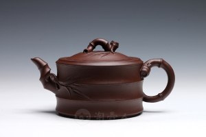 此壶为老师全手精制而成,采用原矿老紫泥作胎,古味浓厚,泡养性佳。壶取一节竹段为形,肩、口、盖呈同一直线,钮、流、把均为竹节形态,其中壶把的竹梢处分杈;竹叶自钮、把处向盖面、壶身延伸,贴塑的极为精细,其中壶面的两片竹叶呈相反方向盘恒;腰部凸出环线一周,将竹段的形态更为贴切的展现了出来。此壶各部位搭配的恰到好处。