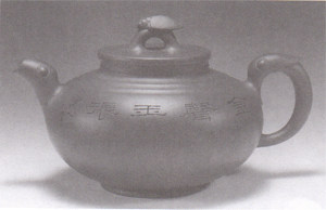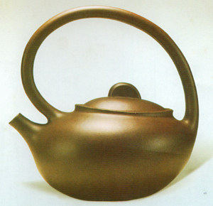 ---何挺初运用镂空和浮雕装饰紫砂陶艺的体会 宜兴紫砂陶以其千姿百态的造型和朴雅大方的装饰而深受人们的喜爱与青睐。但艺术的生命贵在创新,紫砂陶艺的发展也是如此。本人在近半个世纪的从艺生涯中,一方面在造型上创新求变。如被香港茶具文物馆收藏的《浪花提梁壶》,我把提梁设计成弯曲前倾犹如一波前冲的水浪,大大增加了此壶的动感;而我的《秀竹提梁茶具》,提梁由两根竹枝弯曲交叉因而有三个分叉,对传统的提梁造型作了创新。另一方面,我更在装饰上精心构思,别出心裁