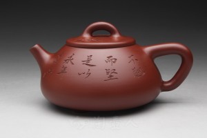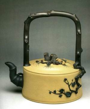 塑器:仿照各类自然动、植物造型并带有浮雕半圆装饰的茶壶。特点是巧形巧色巧工,构思奇巧、肖形而不俗套;理趣兼顾,巧用紫砂泥的天然色彩,取得神形兼备的效果。如树瘿壶、南瓜壶、梅桩壶、松干壶、桃子壶等等。