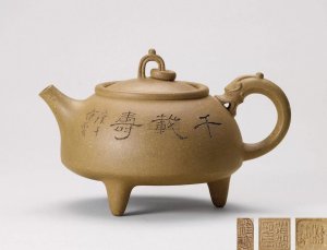 清康熙陈鸣远制传香壶,方斗造型俊秀,筋线利落,刻黄庭坚诗句铭文,工艺精巧,为其自用佳作,历经名家递藏,流传有序,是紫砂收藏珍品。