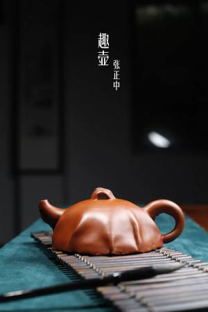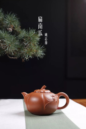 采用原矿红泥制作而成,壶容量为390cc,此壶呈半圆型,一弯流壶嘴,壶嘴微微翘起,桥型壶钮,耳形壶把,握手合适。壶身周围做好之后捏塑而成,此壶只有一个胚,先制壶之后,再一点点修饰出这样的痕迹,此壶难度极大。