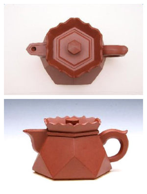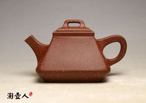 紫砂壶式的鉴定还应该注意壶式中的一些细微特点。例如,紫砂壶的器形,有年代越早器形越大的特点。明代紫砂壶,器形稍大,气势沉稳;清代紫砂壶器形变小,以小壶居多。又如壶把,有提梁和端把两种,明代的提梁的环体赵向于浑圆,但用手触措即会感到提梁的内侧一面是起棱的,以便提握。清代中期则变为扁提梁或六方提梁。明代紫砂壶的端把较大,形式比较舒张;清代前期紫砂壶的端把呈耳朵形,造型变小;清代中期以后的紫砂壶的端把呈倒耳形,有的耳把下部还出现一个小垂饰。再如壶流根部的出水孔,在不同年代也有所不同。明代至清初均为独孔,