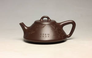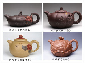 陶刻题名不仅是紫砂壶的艺术装饰手法,更是作者本人的情感和精神上的寄托,能直接反映了作者本人的文化底韵和艺术修养。陶刻内容和画面、布局、书法、刀法等相互溶合。决定了紫砂壶的艺术品味。两者交相辉映,与壶体互补互助,乃至相得益彰,以达到精美的境界。