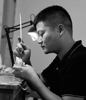 袁小强,男,1973年生于宜兴陶艺世家,2017年国工,中青辈优秀实力派陶艺家,宜兴紫砂陶优秀承传人。兄长为2013年高工袁国强老师,曾受到何道洪大师亲力指点。1988年进宜兴紫砂工艺厂拜丁亚平为师。1997年进入中央工艺美术学院学习深造,并得到工艺美术大师徐汉棠指点。 运用原矿老紫泥作胎,泥料珍贵,包浆极美,有着历经岁月的温润感。以菱花为创作要素,整壶块面分布均匀得当,阴阳相间,纹路清晰。壶盖的菱花形装饰与壶身菱形形状的线条相互呼应,壶的圈足与身筒也是通过线条在形状上相互呼应。壶盖、壶身、圈足三