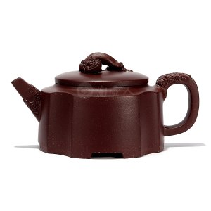 袁小强,男,1973年生于宜兴陶艺世家,2017年国工,中青辈优秀实力派陶艺家,宜兴紫砂陶优秀承传人。兄长为2013年高工袁国强老师,曾受到何道洪大师亲力指点。1988年进宜兴紫砂工艺厂拜丁亚平为师。1997年进入中央工艺美术学院学习深造,并得到工艺美术大师徐汉棠指点。 运用原矿老紫泥作胎,泥料珍贵,包浆极美,有着历经岁月的温润感。以菱花为创作要素,整壶块面分布均匀得当,阴阳相间,纹路清晰。壶盖的菱花形装饰与壶身菱形形状的线条相互呼应,壶的圈足与身筒也是通过线条在形状上相互呼应。壶盖、壶身、圈足三