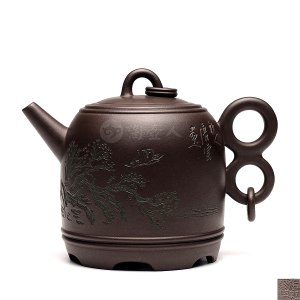 此件金铃壶,为张红华的经典代表作之一,原矿老黑料作胎,形制取材于中国古典民间文化中象征喜庆吉祥的物件【钟铃】,整体造型似钟如铃,工艺鲜明独特,处理手法简练明快。由著名海派画家唐云书画后,再以笔刀精心刻就。