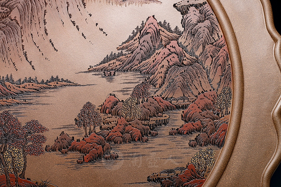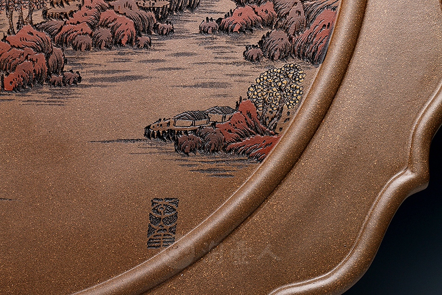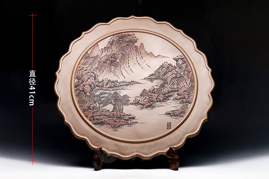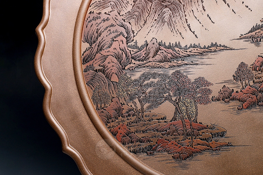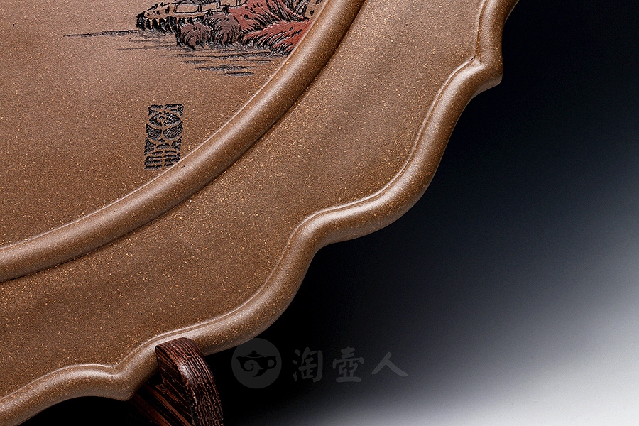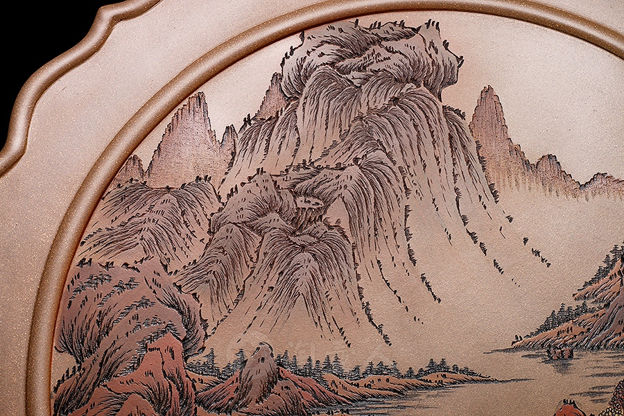 《山水菱花盘》为李峰老师采用原矿紫砂泥,以陶刻加泥绘的独特装饰工艺手法作出山水风景,泥色古朴,画面意境高古。此款为参展作品,不仅可作茶室雅赏陈设,更具收藏价值。
