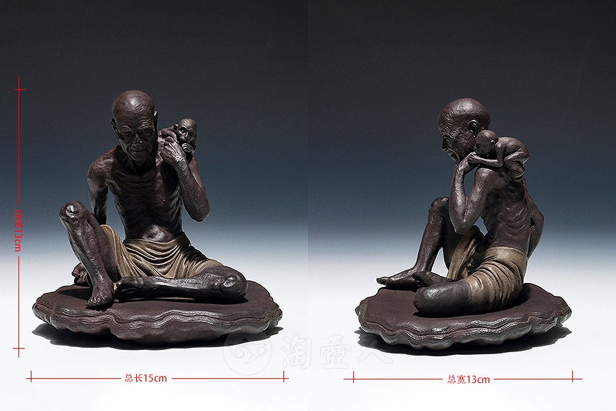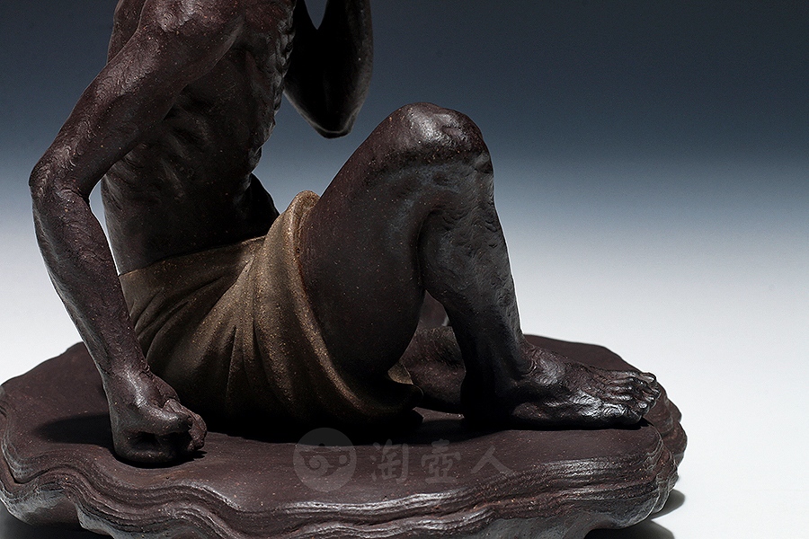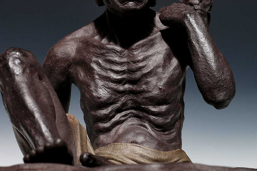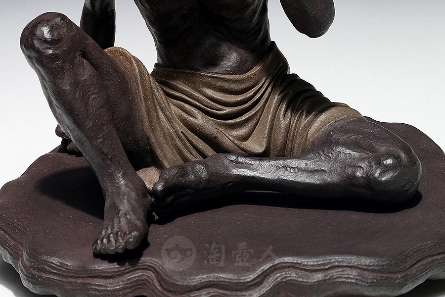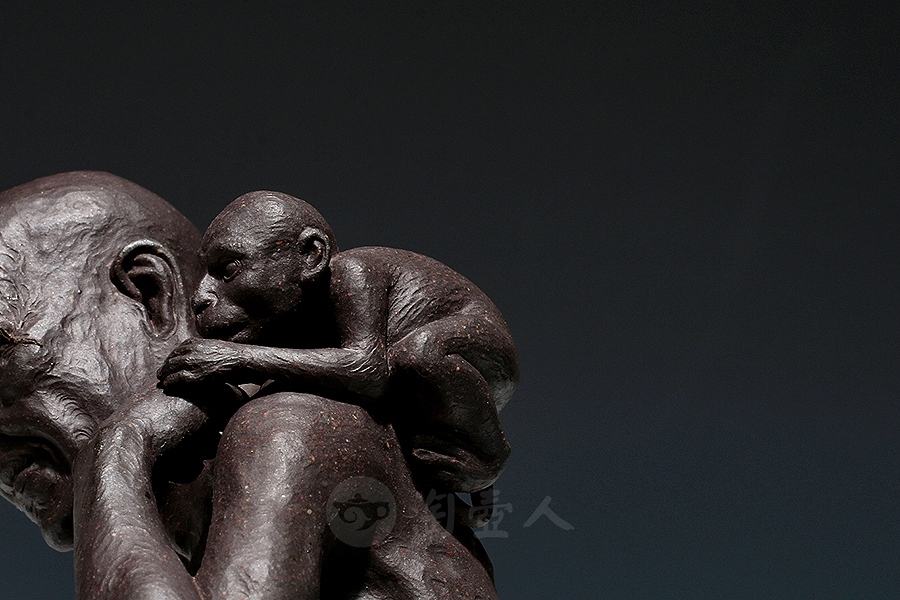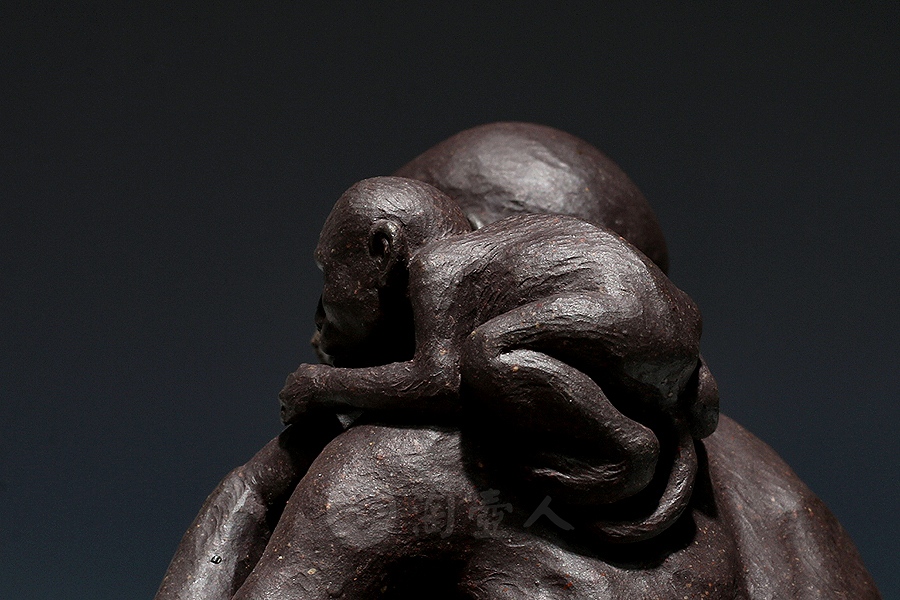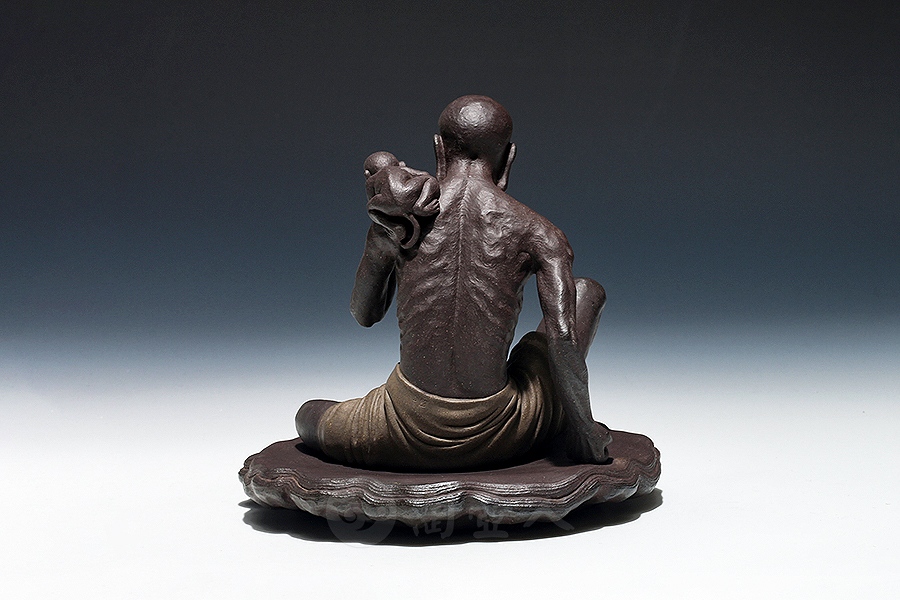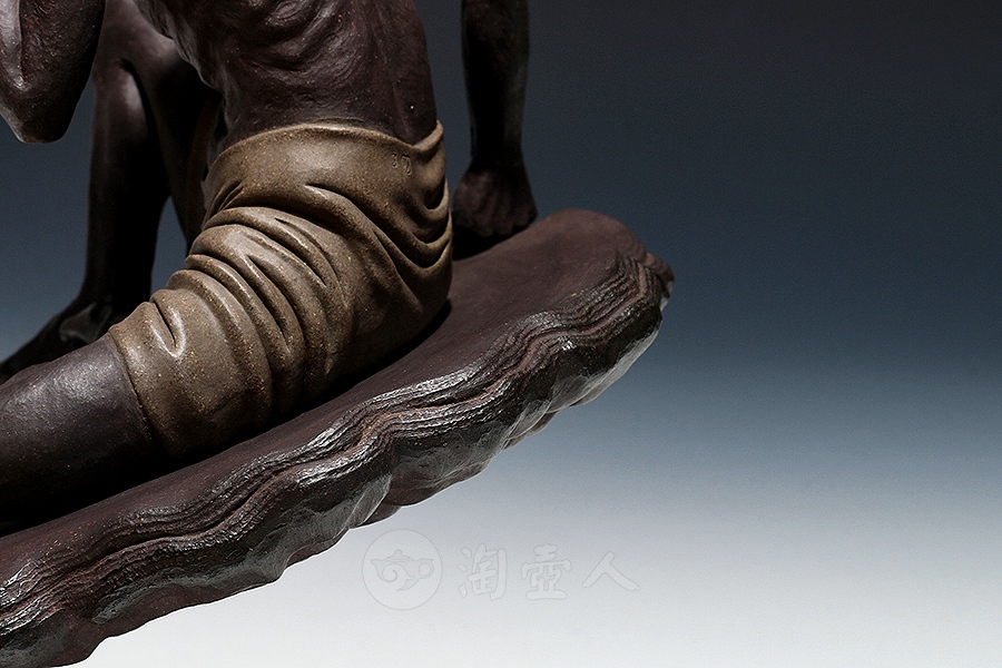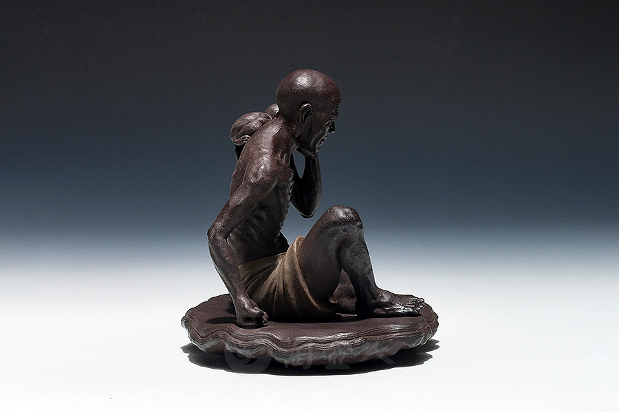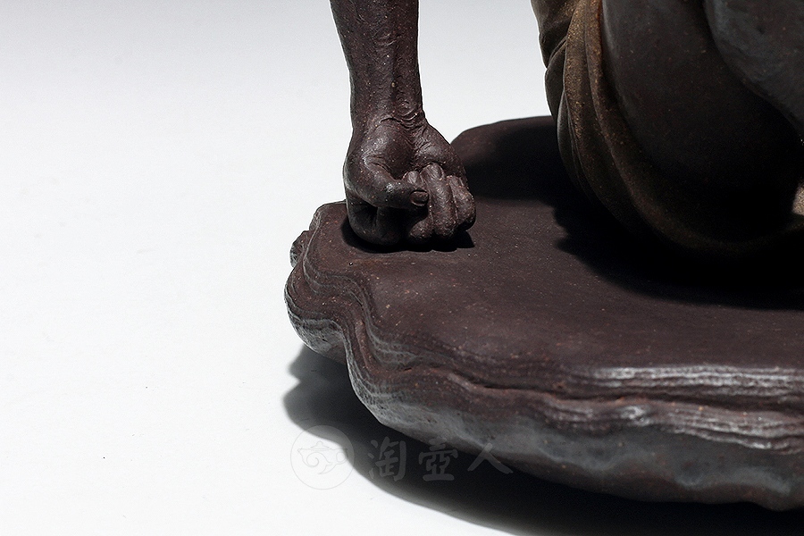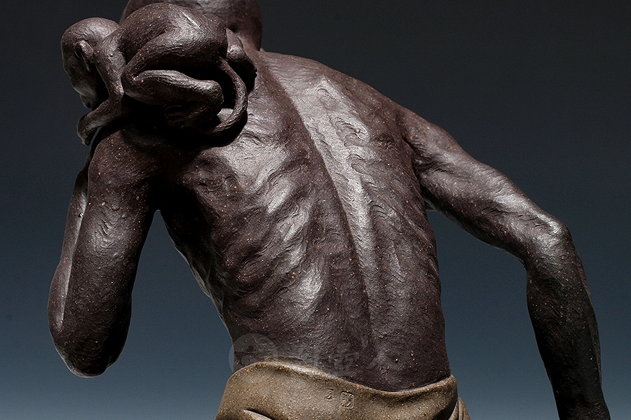 方贞老师将“绘法”平面多彩的造型语言变换“塑法”立体单色的造型语言,细部的经营上更为着力,眉眼五官的“勾描”化作“塑刻”,清晰细微,强调光影效果。精心处理表层的平整细润,使紫砂独特的色泽和肌理充分呈现,表达了“五色土”的本色魅力。由于材质变化,高温烧成后如金如玉。雕塑神采奕奕、意蕴无穷。