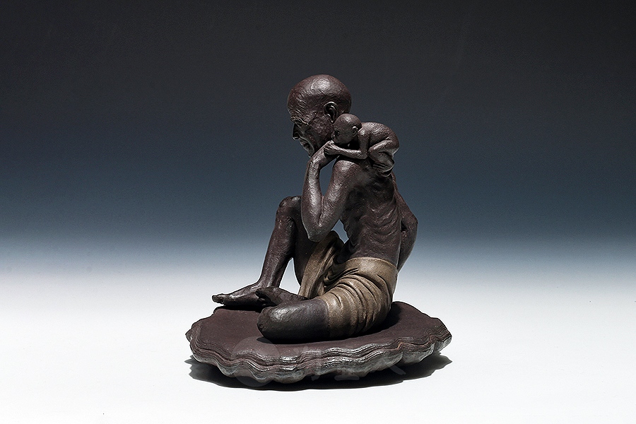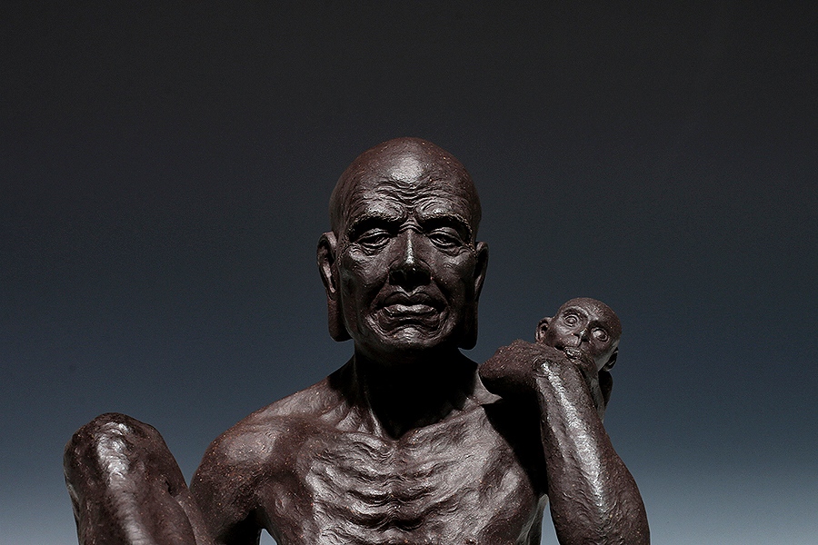 《智缘罗汉》以写实手法塑之,罗汉坐于灵芝之上,裙带缠于腰间,低头做沉思状,一只手握住猿猴,另一只手捶地顿挫,衣袂悬垂自然,躯干枯瘦,仿若一副洞悉天地之间奥秘的姿态。