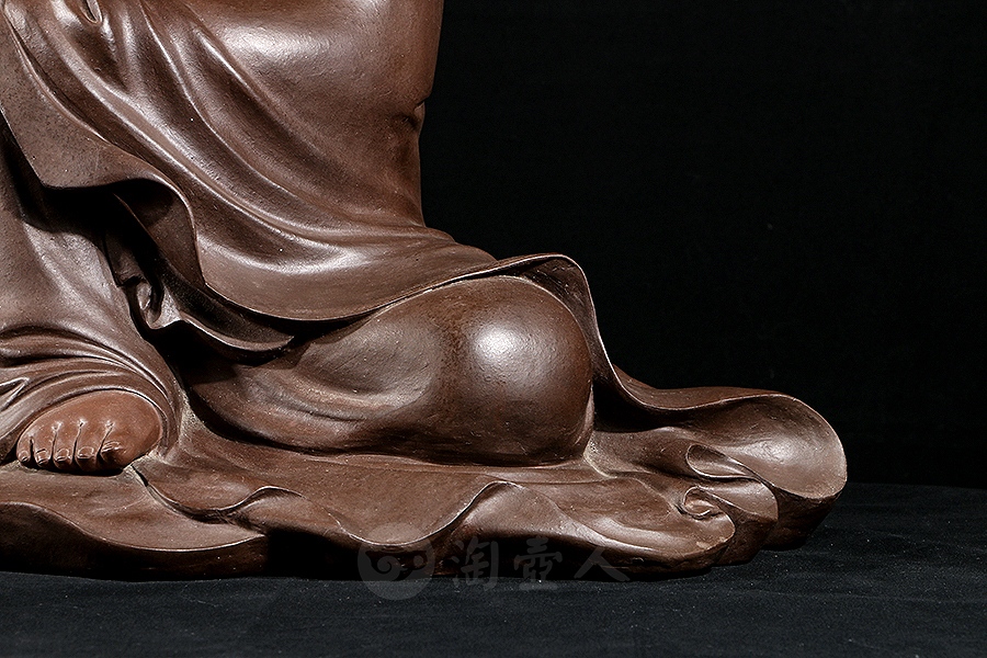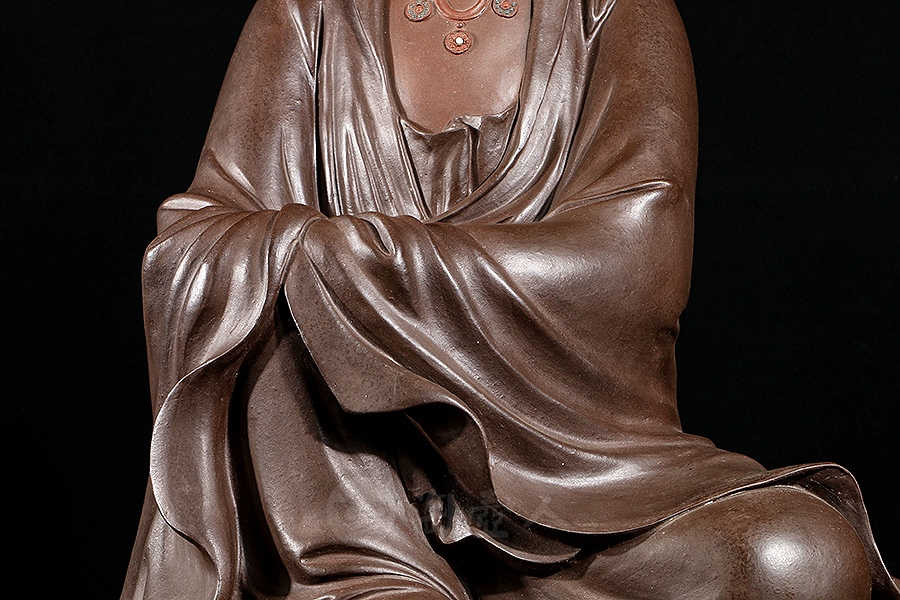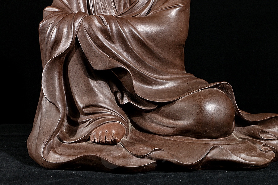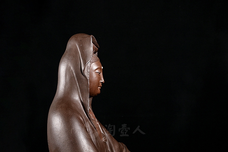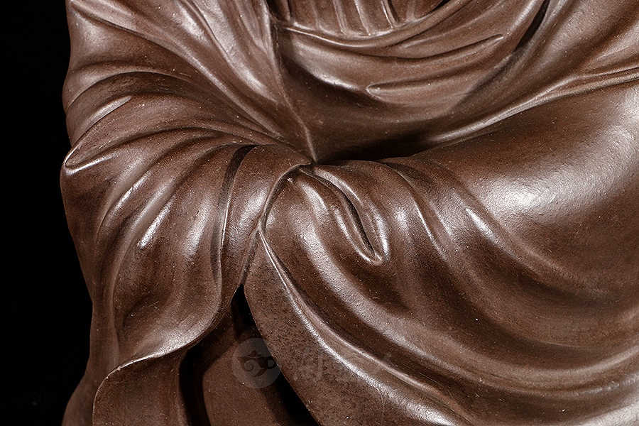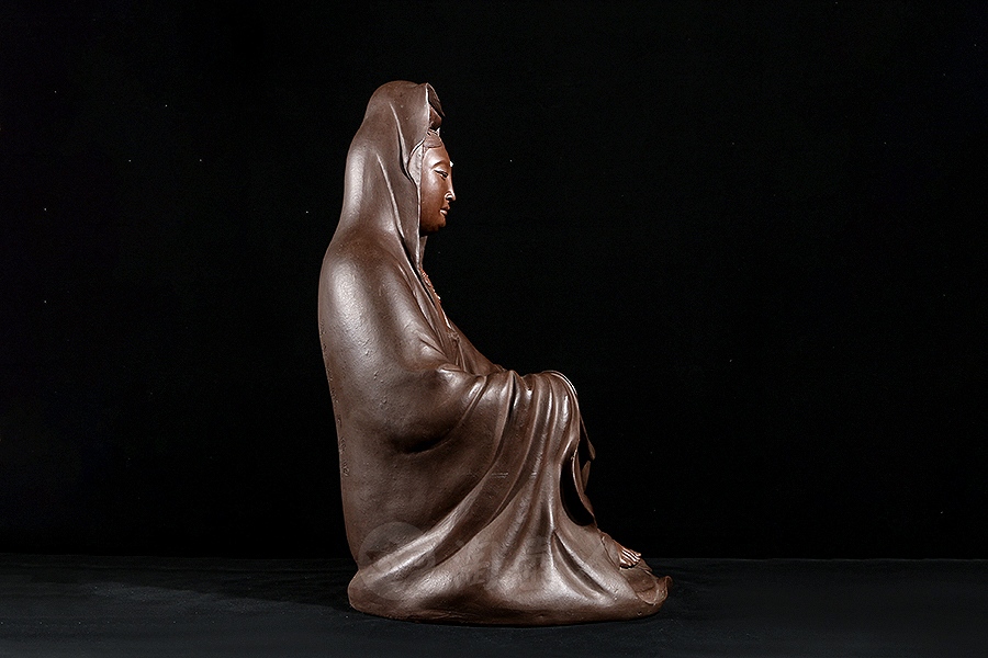她一改佛教造像直立或打坐的成规,右腿曲蹲,左腿曲起,重心落在右胯,双手合于右膝之上,无拘无束,自由自在。其姿态出色地突现了观音流畅的线条和优美的身段。