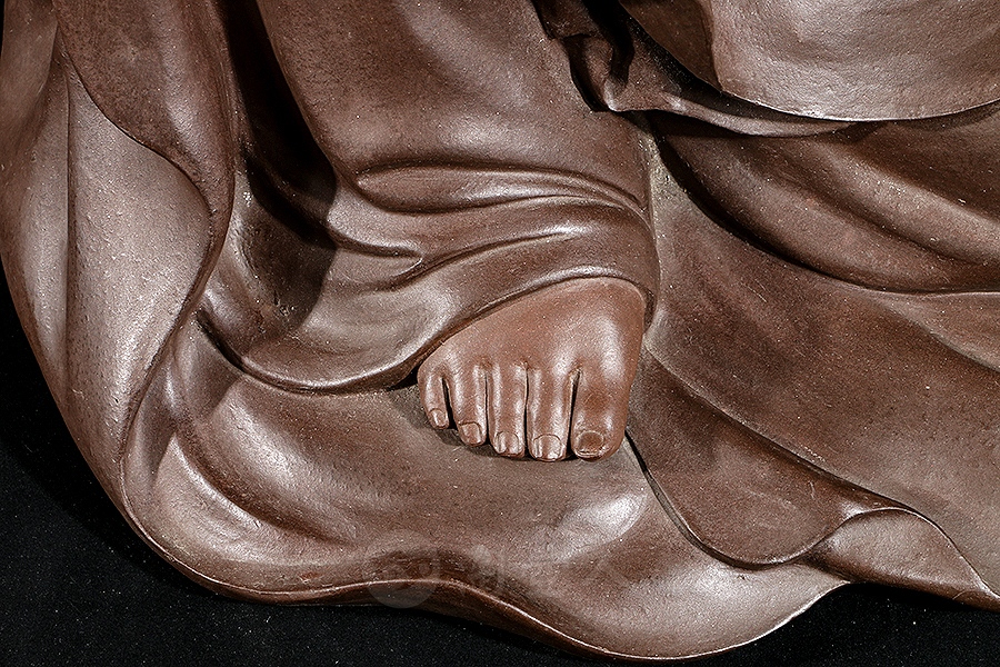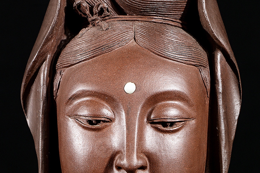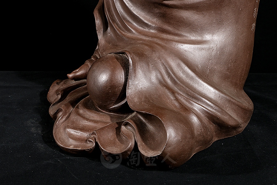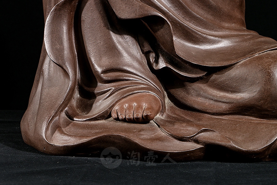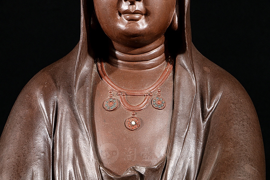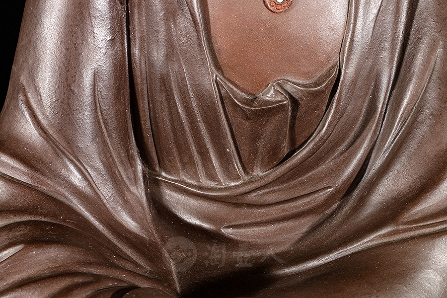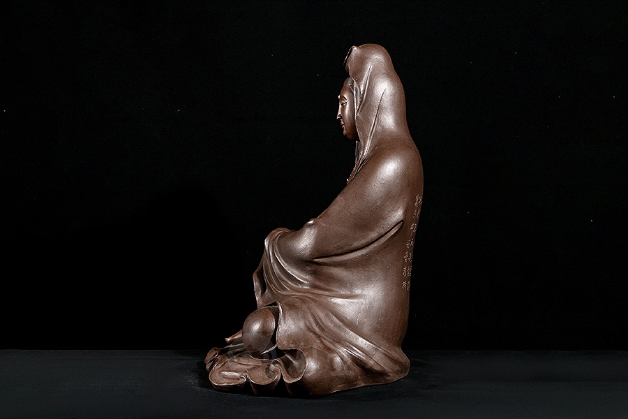 她一改佛教造像直立或打坐的成规,右腿曲蹲,左腿曲起,重心落在右胯,双手合于右膝之上,无拘无束,自由自在。其姿态出色地突现了观音流畅的线条和优美的身段。
