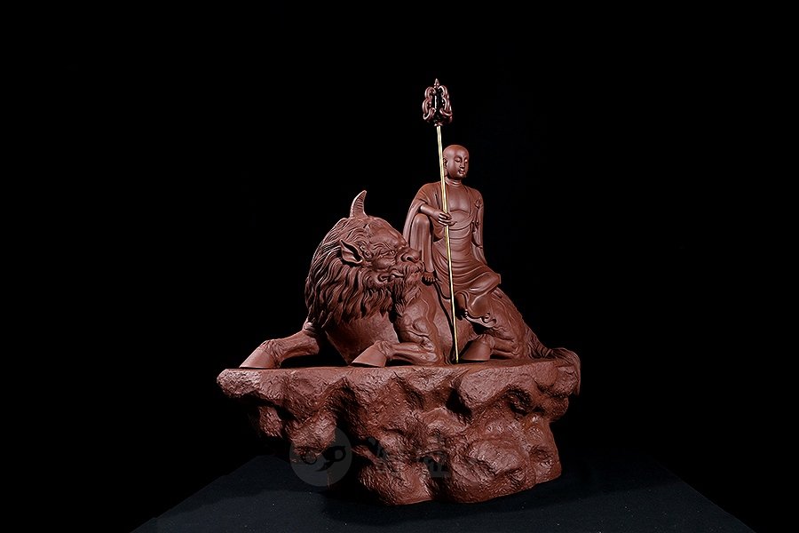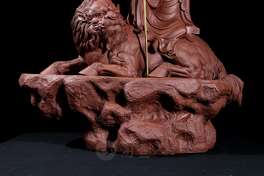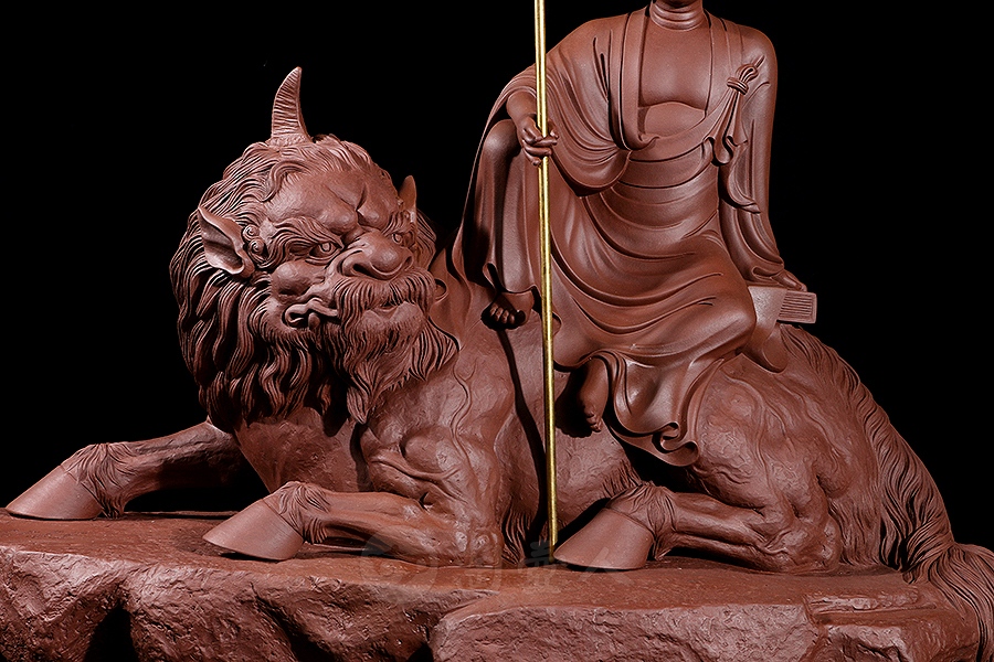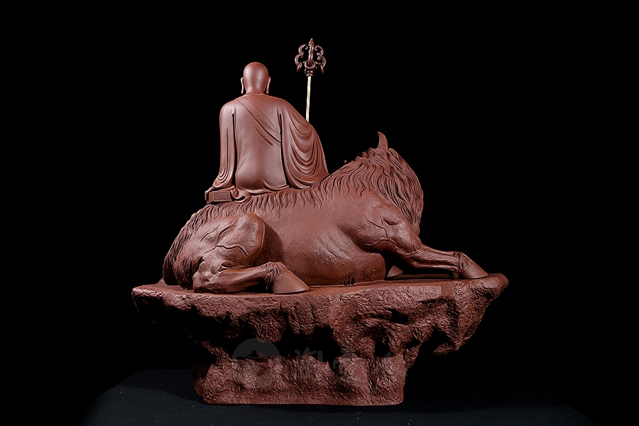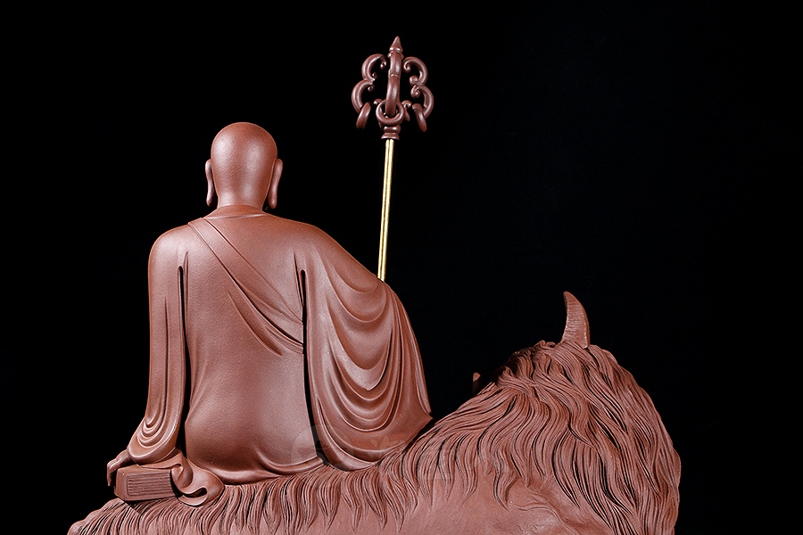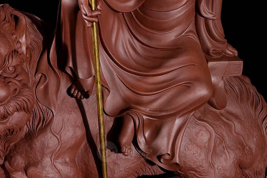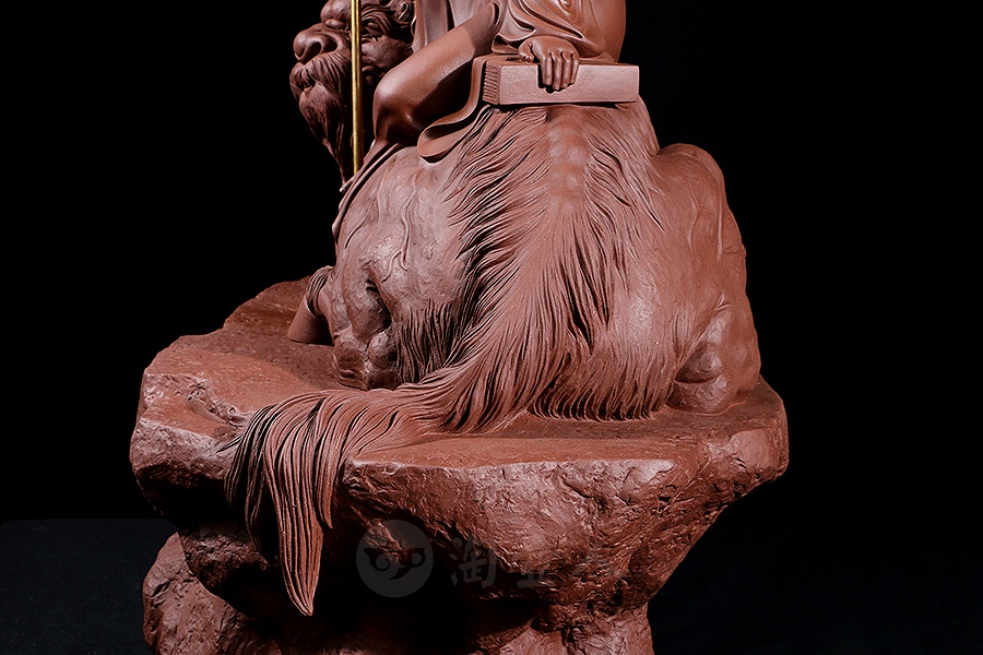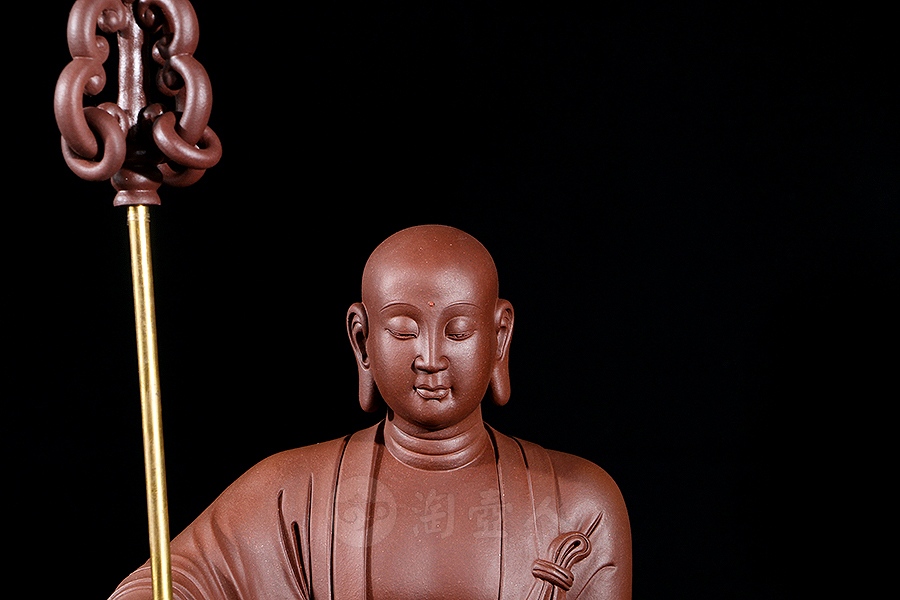 地藏菩萨,或称地藏王菩萨。因其“安忍不动如大地,静虑深密如秘藏”,故名地藏。与观音、文殊、普贤一起,被民间尊为佛教四大菩萨。此像时代特征明显,髡首慈容,身着袈裟,衣纹写实自然,衣袖垂落飘逸。手执锡杖,呈休憩坐姿坐于“谛听”之上,整像比例协调,质地精良,细节雕刻细致入微。采原矿紫泥制成,泥色温润质朴,浑厚而古味。雕塑底部,陶刻“地狱不空,誓不成佛”。