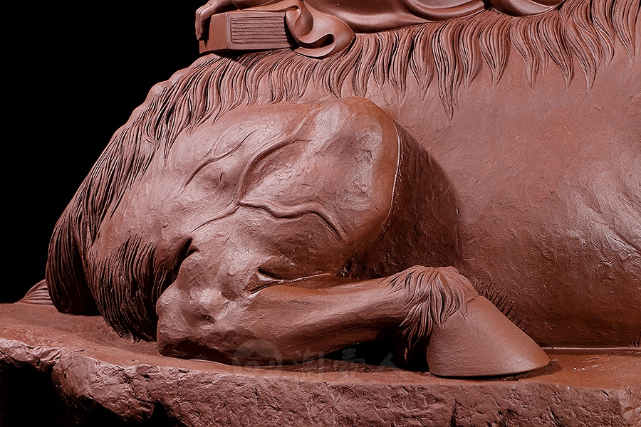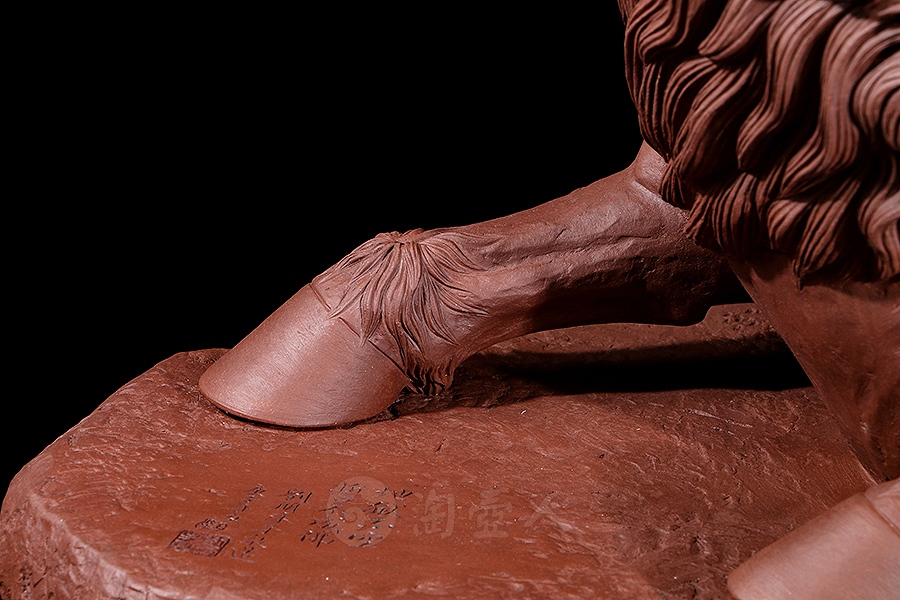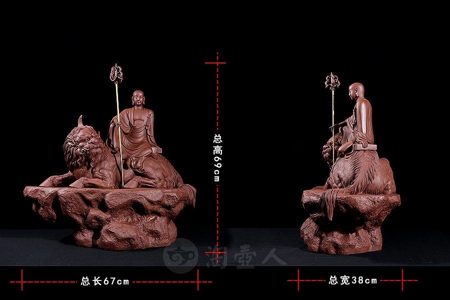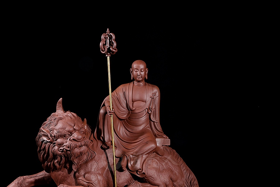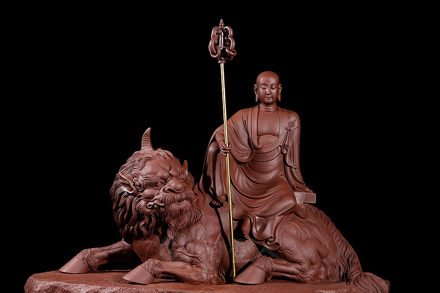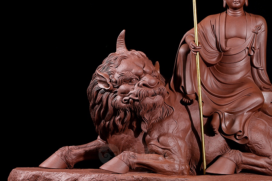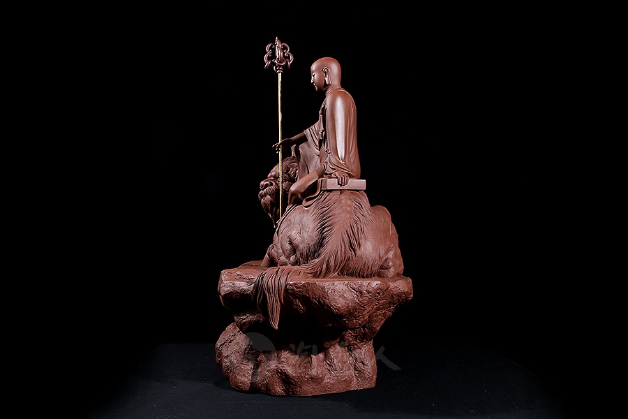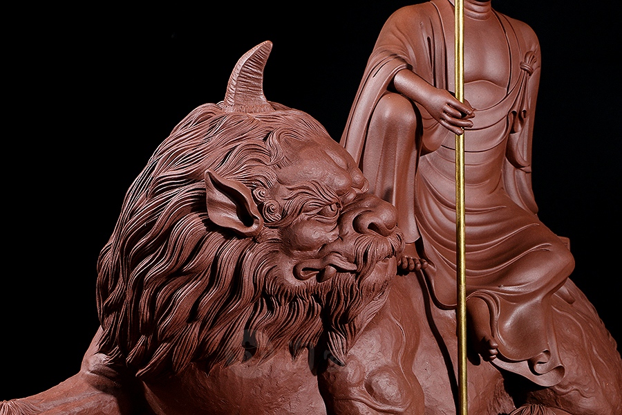 地藏菩萨,或称地藏王菩萨。因其“安忍不动如大地,静虑深密如秘藏”,故名地藏。与观音、文殊、普贤一起,被民间尊为佛教四大菩萨。此像时代特征明显,髡首慈容,身着袈裟,衣纹写实自然,衣袖垂落飘逸。手执锡杖,呈休憩坐姿坐于“谛听”之上,整像比例协调,质地精良,细节雕刻细致入微。采原矿紫泥制成,泥色温润质朴,浑厚而古味。雕塑底部,陶刻“地狱不空,誓不成佛”。