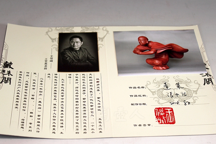 王俊峰,男,生于宜兴丁蜀紫砂世家,实力派陶艺家,1990年毕业于江苏陶瓷专业学校,随后赴北京中央工艺美院进修,主修陶瓷设计和装饰艺术,逐渐形成个人创作风格。2001年创办“藏珠阁”紫砂工作室,其作品以紫砂雕塑、紫砂花器见长,代表作有佛像系列,树桩、梅桩等仿生器系列,技法成熟,功底扎实,意蕴悠远,富有趣味,多件作品入选《中青年杰出陶艺名家》、《茗壶赏析》、《壶史》等书刊,深受海内外藏家喜爱。