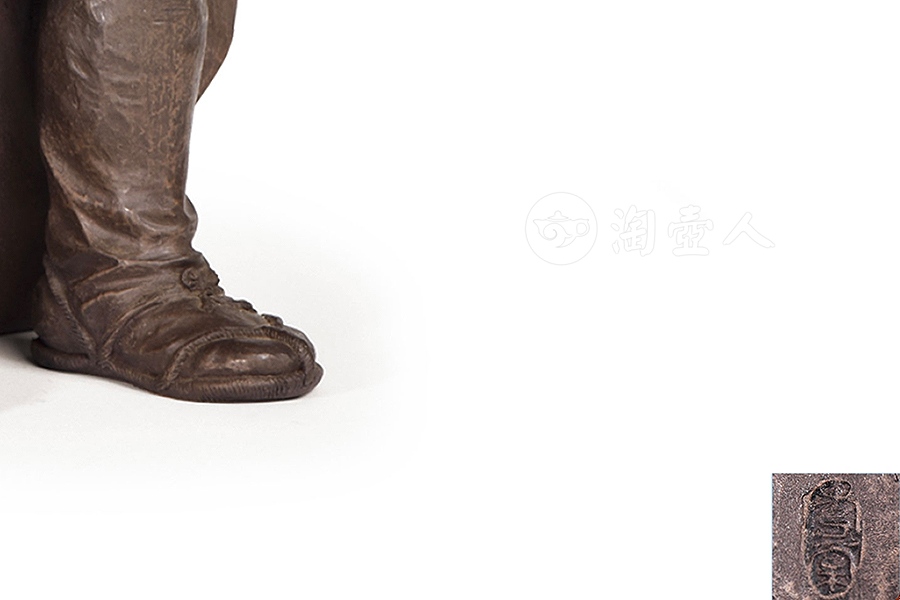 此“始陶异僧”像,由中国工艺美术大师徐秀棠先生于1994年,根据富贵土之传说创制,属于紫砂佛教人物题材。老僧异貌,前额突起,似藏有大智慧,夸张出格而有度,神态玄奥而自信。身着素朴僧衣,身背大竹斗笠,手拿一串五色土,足登漏风僧鞋,衣襟似有飘动之感,于风尘仆仆中指引陶都人去发现富贵之土。雕像背后由徐秀棠先生铁笔镌刻始陶异僧富贵土之传说文字内容。